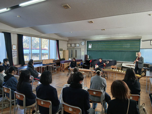 生徒13名(県ケ丘高校10名、蘇南高校3名)を対象に邦楽(三曲)鑑賞・教授教室を開催しました。